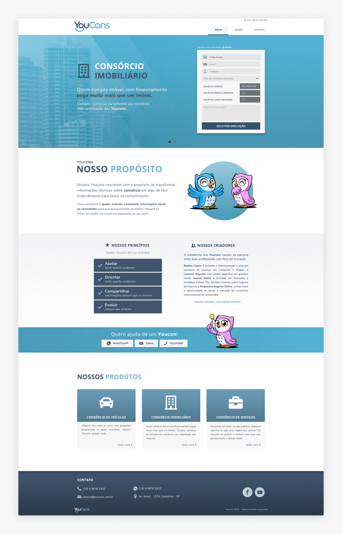 Optou-se por seguir o modelo de site "one page" para minimizar a quantidade de informações e dar foco à solicitação da simulação de consórcio para geração de lead. Mais informações sobre a empresa e serviços viriam logo abaixo, que também estariam disponíveis através do blog e redes sociais.