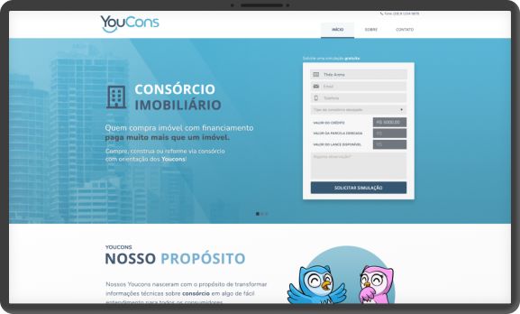 A Youcons é uma plataforma onde é possivel simular, buscar e contratar consórcios diretamente pelo site, funcionando como um agregador de ofertas de consórcios.
